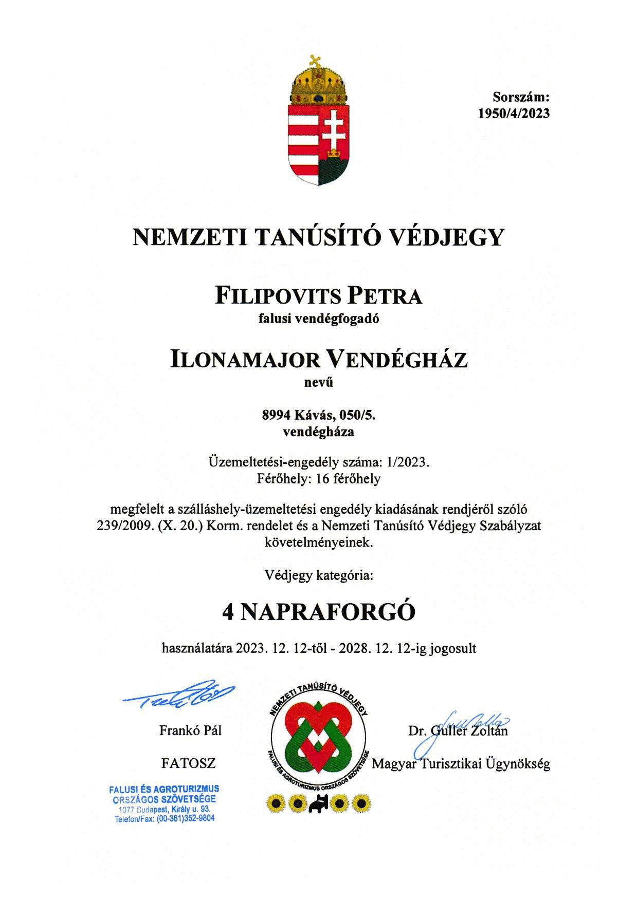 Vendégházunk 4 napraforgós besorolást kapott!